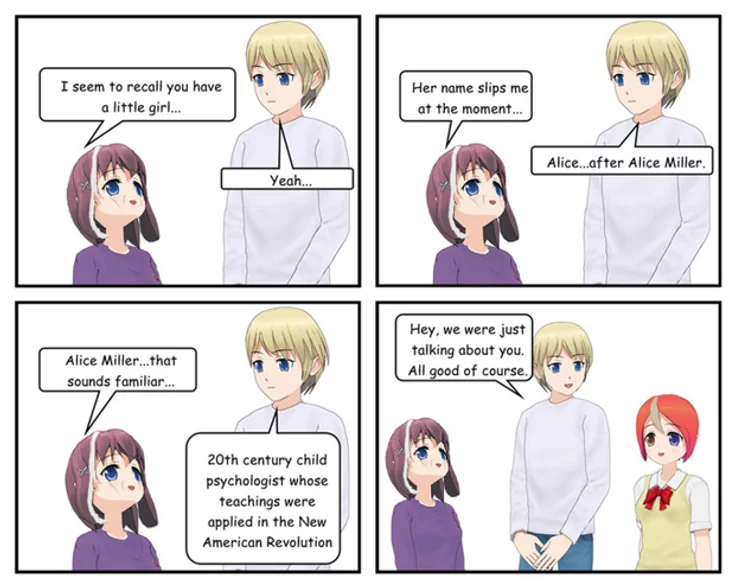 Not only did Miller empower readers to question established norms, like we do today on other topics, and strive for healthier, more nurturing approaches to raising children, she gave Children’s Rights Activists like the late Jordan L. Riak, who founded Project NoSpank, or even myself, a mere pseudo-illustrator who uses computer-generated human forms from Vroid, and can barely draw a stick figure in real life, a really great tool for for combating Toxic Pedagogy. Her work has profoundly impacted therapy and counseling, inspiring therapists to explore the roots of their clients' struggles in early childhood experiences, emphasizing empathy, validation, and understanding as essential components of effective therapy, influencing now two generations of mental health professionals.