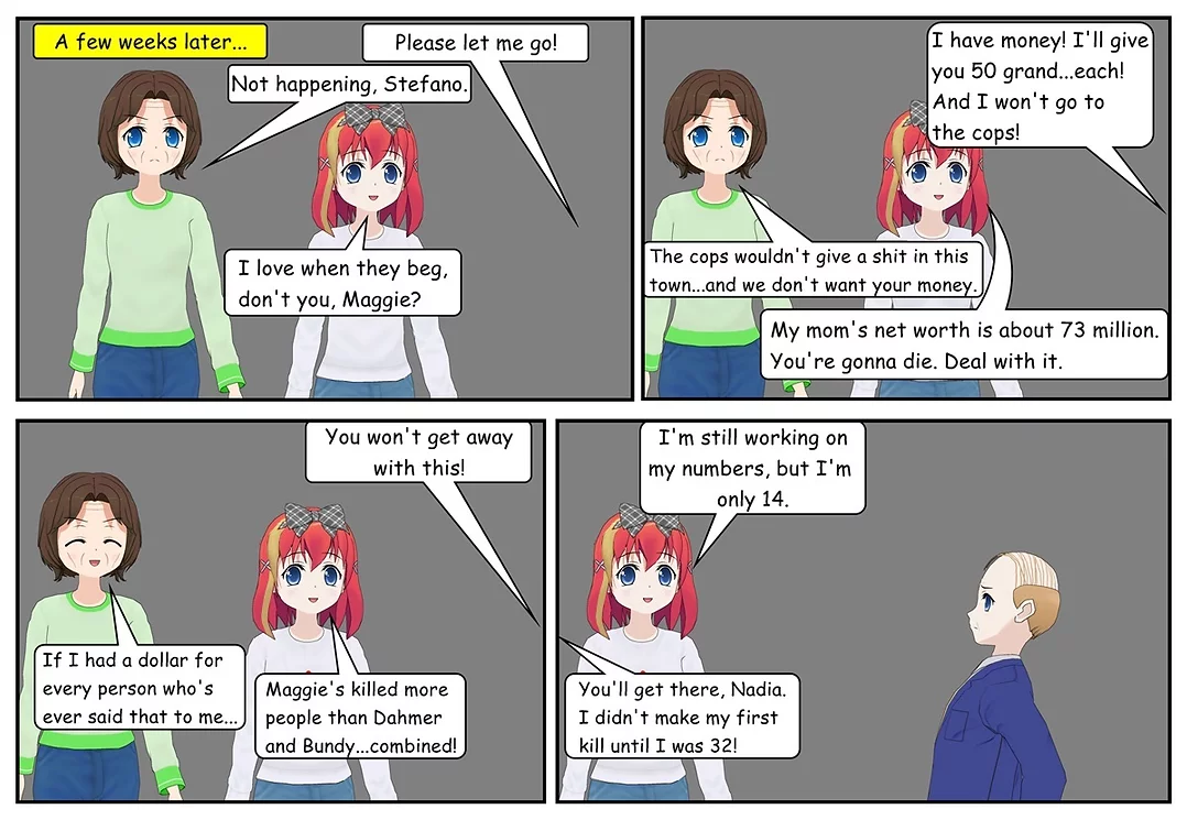 Nobody’s Property (nobodysproperty.com) is a fictional illustrated series, designed purely for entertainment and storytelling. It is imperative that readers refrain from emulating any of the vigilante or homicidal deeds carried out by characters like Nadia or others featured on nobodysproperty.com. These actions exist solely within the realm of fiction and should never be replicated in reality. Engaging in such behaviors can lead to dangerous consequences and is in direct conflict with ethical and legal norms. Always prioritize responsible and lawful conduct in the real world. Please do not attempt any actual acts of homicide or vigilantism, such as those committed by Nadia or any of the other characters on nobodysproperty.com