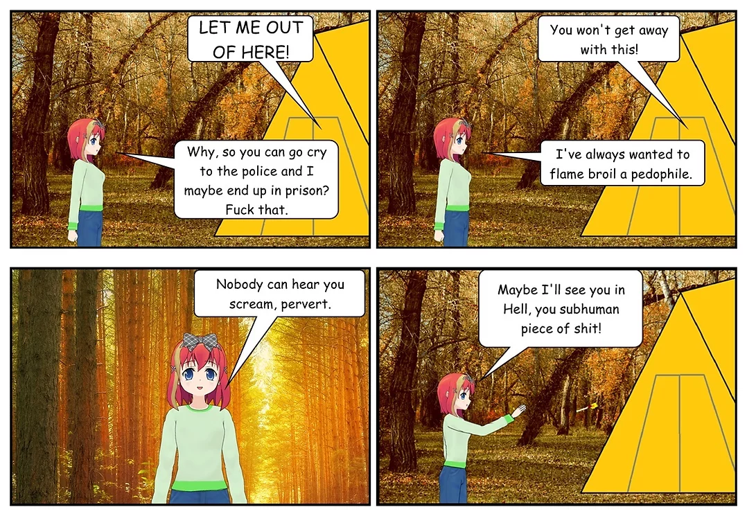 Participating in acts of vigilante homicide, akin to Nadia from Nobody's Property, even in an attempt to subject child molesters to justice, is strongly discouraged for numerous reasons. While the pursuit of justice is commendable, adopting a vigilante stance, especially involving intentional acts of homicide, can lead to grave consequences.