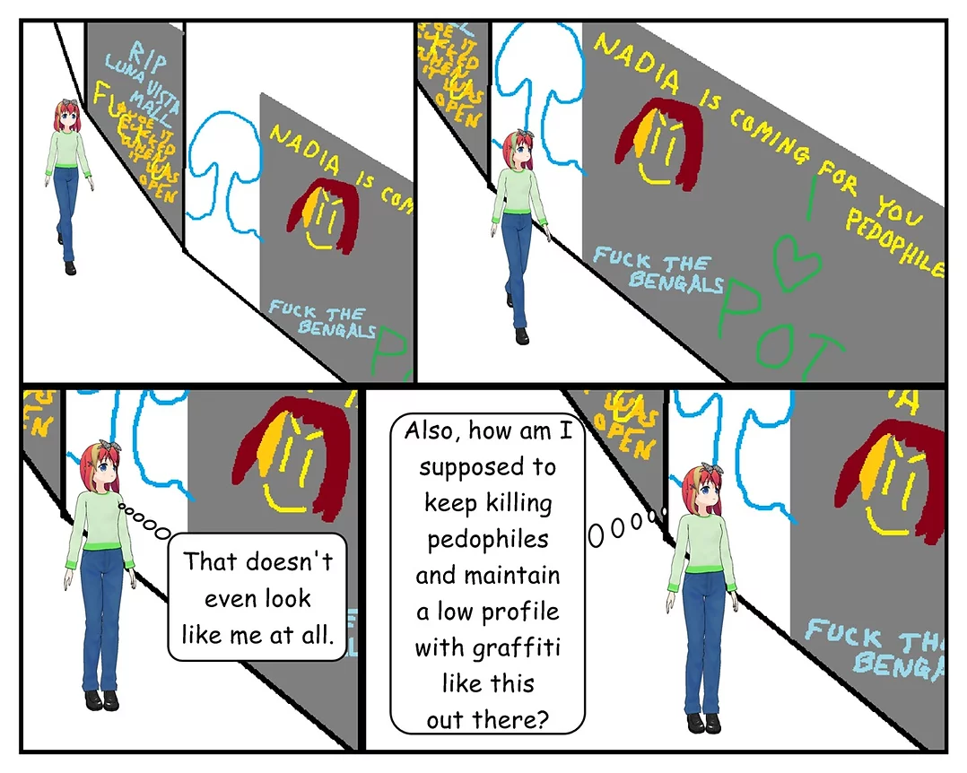 Nobody’s Property (nobodysproperty.com) is a fictional illustrated series, designed purely for entertainment and storytelling. It is imperative that readers refrain from emulating any of the vigilante or homicidal deeds carried out by characters like Nadia or others featured on nobodysproperty.com. These actions exist solely within the realm of fiction and should never be replicated in reality. Engaging in such behaviors can lead to dangerous consequences and is in direct conflict with ethical and legal norms. Always prioritize responsible and lawful conduct in the real world. Please do not attempt any actual acts of homicide or vigilantism, such as those committed by Nadia or any of the other characters on nobodysproperty.com