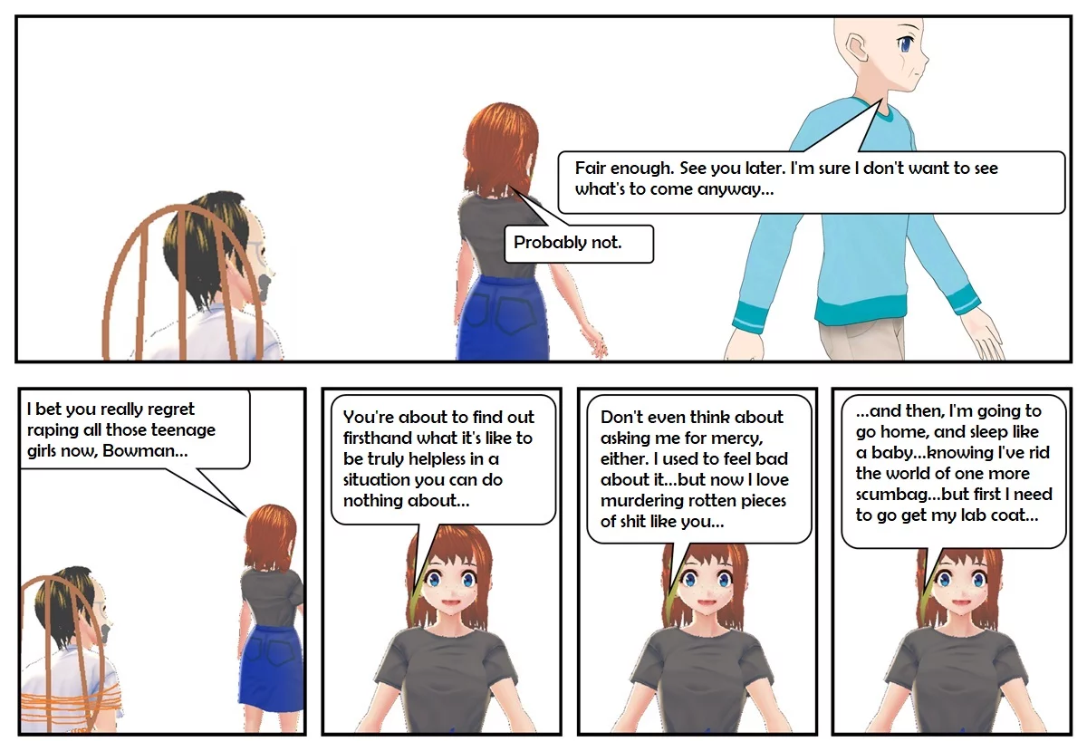 Nobody’s Property (nobodysproperty.com) is a fictional illustrated series, designed purely for entertainment and storytelling. It is imperative that readers refrain from emulating any of the vigilante or homicidal deeds carried out by characters like Nadia or others featured on nobodysproperty.com. These actions exist solely within the realm of fiction and should never be replicated in reality. Engaging in such behaviors can lead to dangerous consequences and is in direct conflict with ethical and legal norms. Always prioritize responsible and lawful conduct in the real world. Please do not attempt any actual acts of homicide or vigilantism, such as those committed by Nadia or any of the other characters on nobodysproperty.com